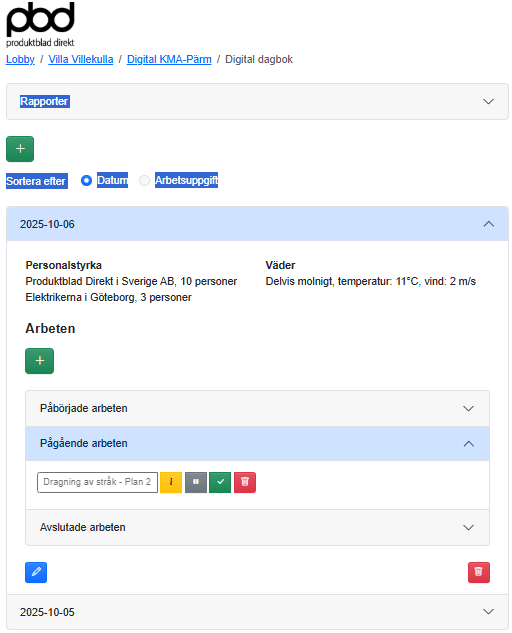 Det går också att att sortera utifrån påbörjade, pågående och avslutade arbeten.