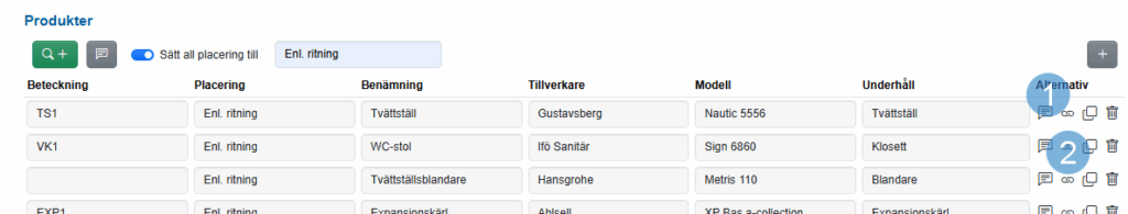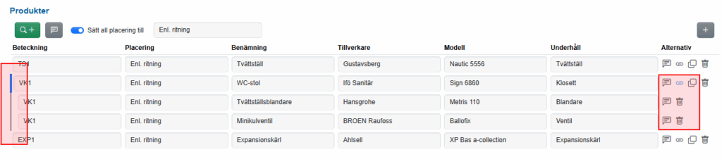 Ute i listan över produkter åskådliggörs länkade proukter på två sätt: